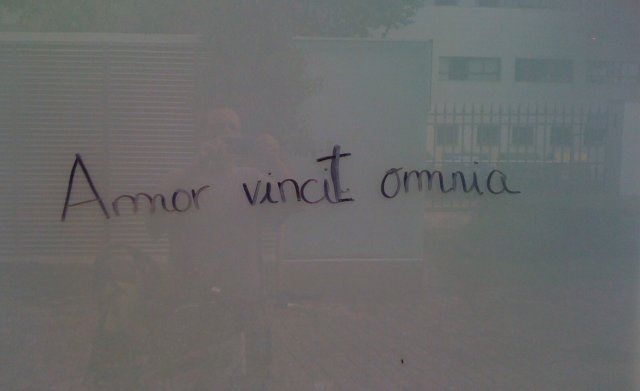 Descobreix de cop que aquesta serà la divisa de la seva vida. I quan acaba la classe, agafa un retolador permanent i comença a pintar uns vidres que hi ha al parc de davant l'institut.
