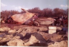També tenc, gràcies a l’artanenc Miquel Pastor, una crònica de la revista Bellpuig que explica les històries que varen venir a continuació. Els coloniers, que havien aconseguit que el Ministeri de Marina els cedís la còrpora, seguiren intentant treure-la a terra, sense aconseguir altra cosa que varar-la a l’arena. El problema, aviat, va ser desfer-se’n. Els intents de fer-ne trossos amb ganivets i serres mecàniques (quina gran escena per a la pel·lícula!) varen fracassar. Es va decidir treure-la badia endins, fondejar-la i que fos pastura per als peixos. Fins i tot hi va haver un toc de Spielberg: durant l’operació varen venir tintoreres que se’n duien quaranta quilos de carnassa en cada mossegada. Però encara hi faltaven peripècies sonades: els dies 26 i 27 hi va haver un temporal que va tornar les restes de la balena a terra. No va quedar més remei que fer-ne foguerons d’un Sant Antoni endarrerit. Sembla que la pudor es va fer indescriptible. Els homes que hi varen participar, diu el cronista, varen quedar sense ganes de menjar peix durant mesos.